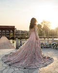 The exquisitely decorated Aysana accentuates the brilliance of contemporary design elements. Silver and gold hand works are laid out intricately on this generously flared silhouette which features an elaborate floor sweeping back trail. Its artwork is a unification of Victorian vintage frames and Mughal inlay work wrought attentively using pearls, sequins, naqshi and stones. Paired with a gorgeously hand detailed dupatta, Aysana blossoms with femininity and grace.