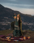 Description: An emerald green hand worked set featuring delicate tracery and floral trellises on the gharara and meticulous booti work on the kameez. Paired with a hand embellished dupatta.