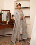 Embodying elegance, Edrina is a stunning grayish blue ensemble that reflects early Islamic art compositions from Mughal landmarks. The shirt showcases a bedecked cartouche that frames embellished rose, iris and narcissus motifs wrought using naqshi, kundan and resham. This ensemble is paired with an organza dupatta. The sophisticated silhouette and fine craftsmanship make Edrina a beloved choice, time and again.