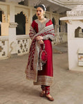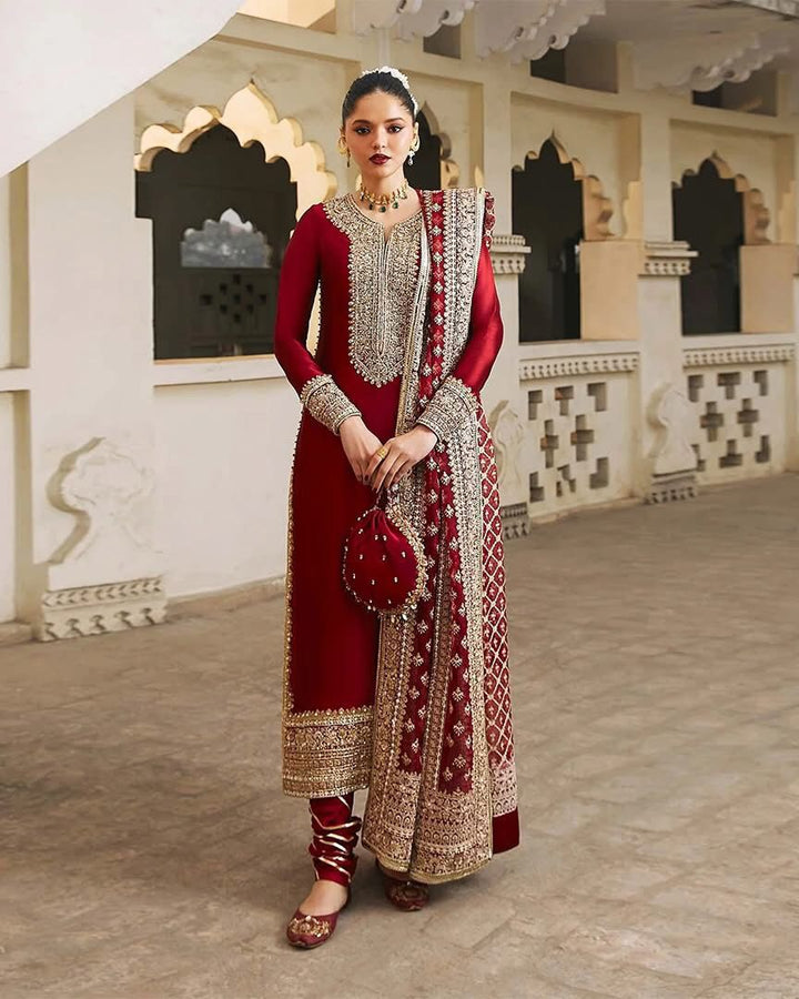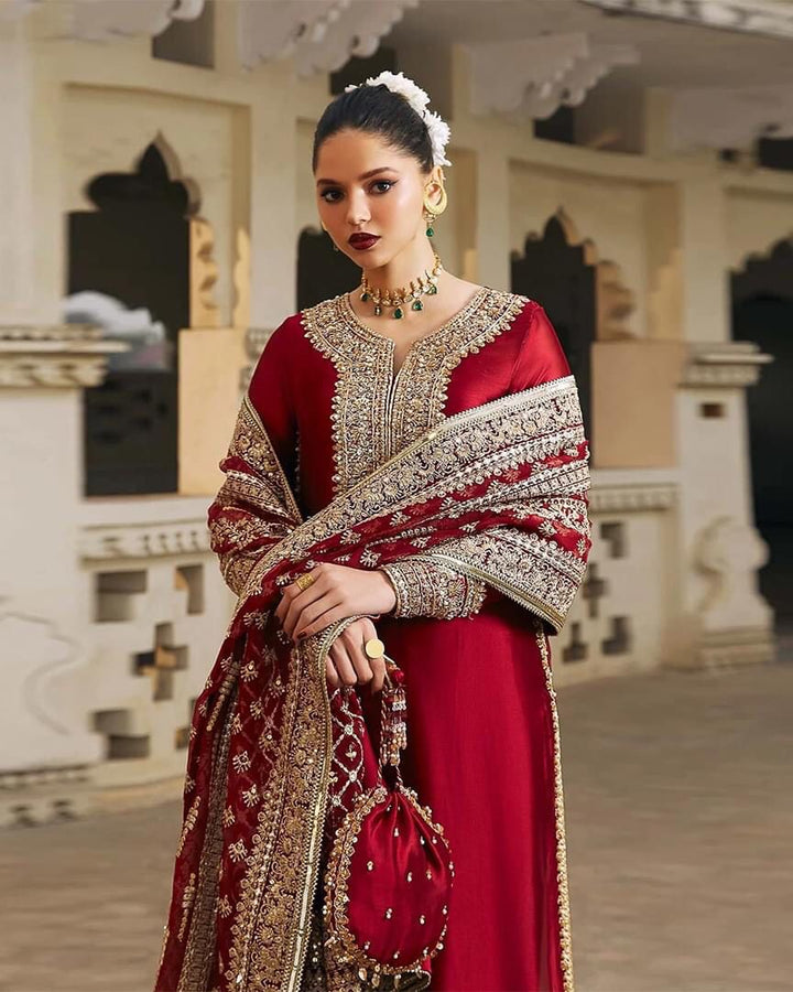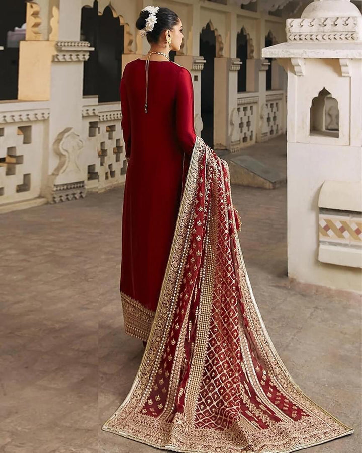 Indulge in the epitome of elegance with our exquisite long tissue silk shirt in a luxurious rich deep red tone. This opulent attire is a testament to timeless beauty, featuring intricate embroidered borders and a neckline that adds an extra layer of sophistication to its design. The meticulous craftsmanship is evident in the fine embellishments adorning the entire border of the shirt, creating a stunning visual feast. To elevate the ensemble further, the outfit is accompanied by a fully embroidered dupatta, adding a touch of glamour and completing the ensemble with finesse.