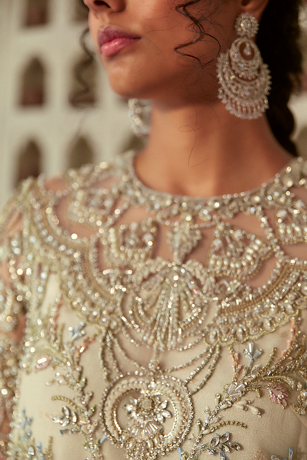 - IVORY COLOURED LONG SHIRT CRAFTED IN A GORGEOUS INTERLAY OF PEARL ENCRUSTED HAND EMBELLISHMENT.