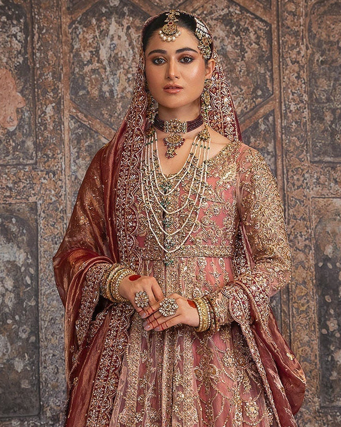 A Bold vermilion front open, soft net pishwas is adorned with magnificent rose motifs on the bodice using Dhabka, Nakshi and Mukesh. It is layered over a jamawar lehnga with an ethereal, scalloped tissue dupatta with an intricate yet heavy zardozi border. Dreamy and purely majestic this bridal outfit has an old-world charm reflected through the use of fabrics and hues. Truly a modern day classic.